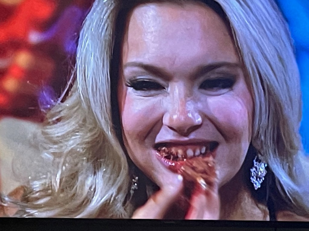 Next, we go into another game and perhaps the most disturbing scene I’ve seen on this franchise. Cat wants to play “How many meatballs can you stick in your mouth?” You guys… when I say I audibly gagged while watching this I am not being dramatic. Thier mouths were wide open as they shoved in meatballs – there was so much sauce in their teeth. They wouldn’t stop talking… with several meatballs lodged in their mouths. She kept shoving them in, but also was chewing them at the same time. I hate it here.